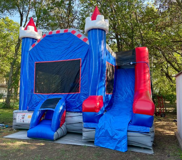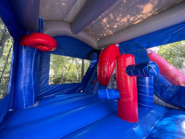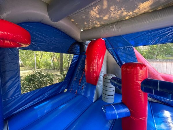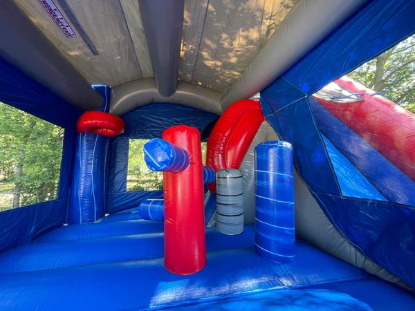 Medieval 5in1 Combo interior includes baskets ball hoop 2 Inflatable obstacles and a large bouncing area